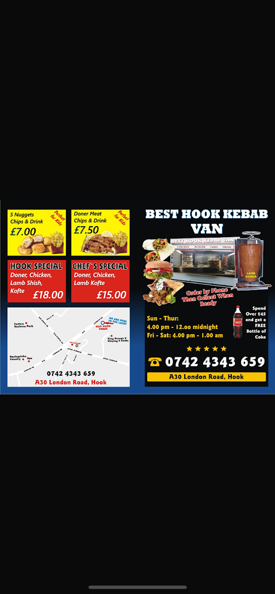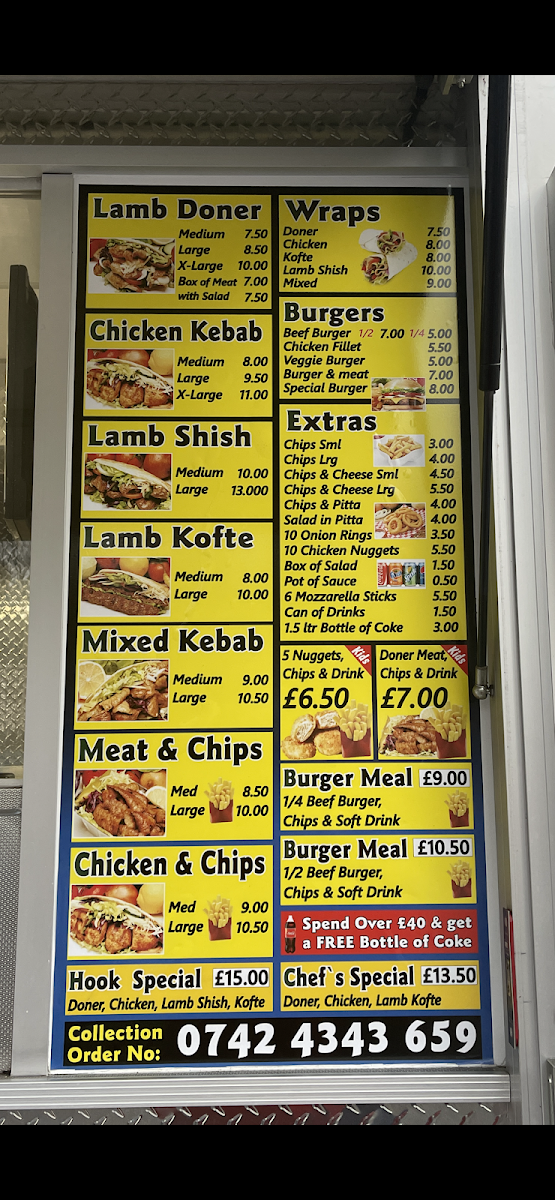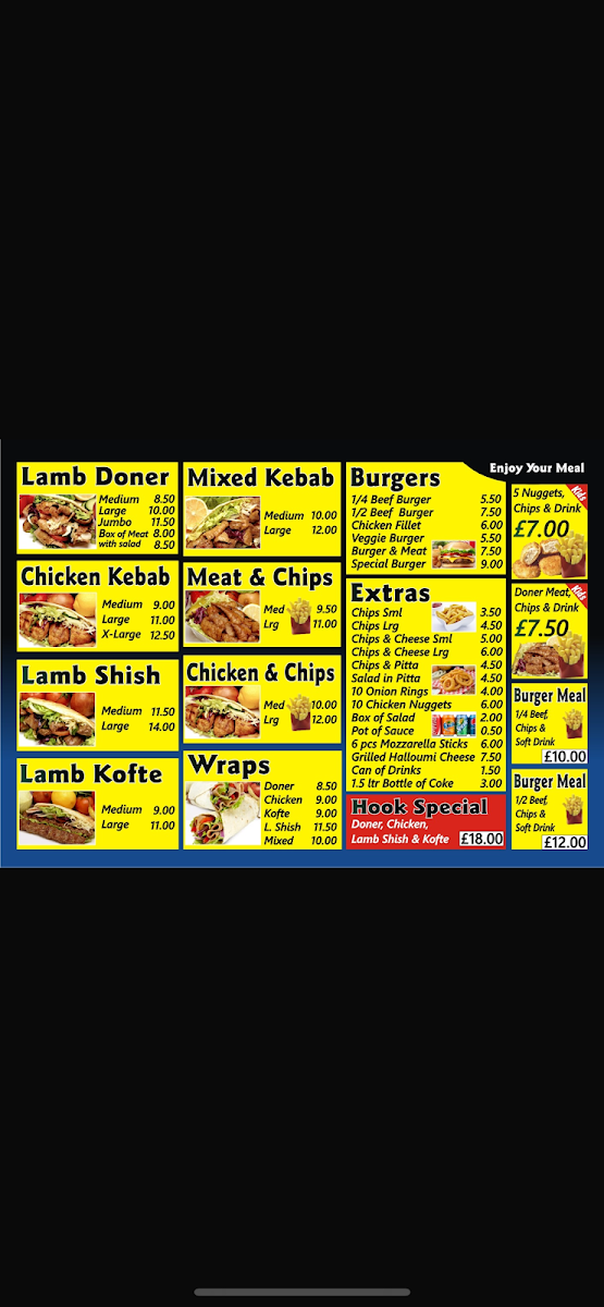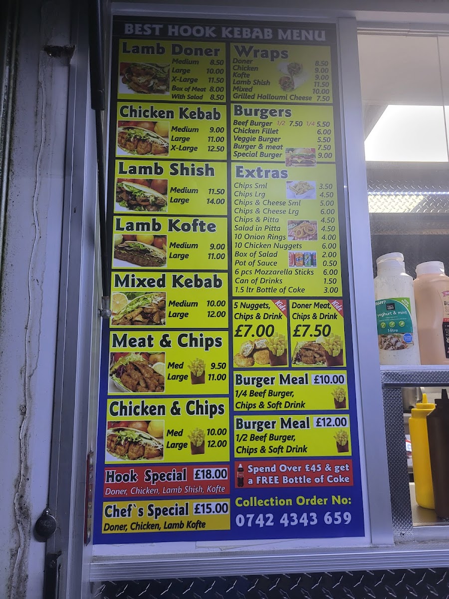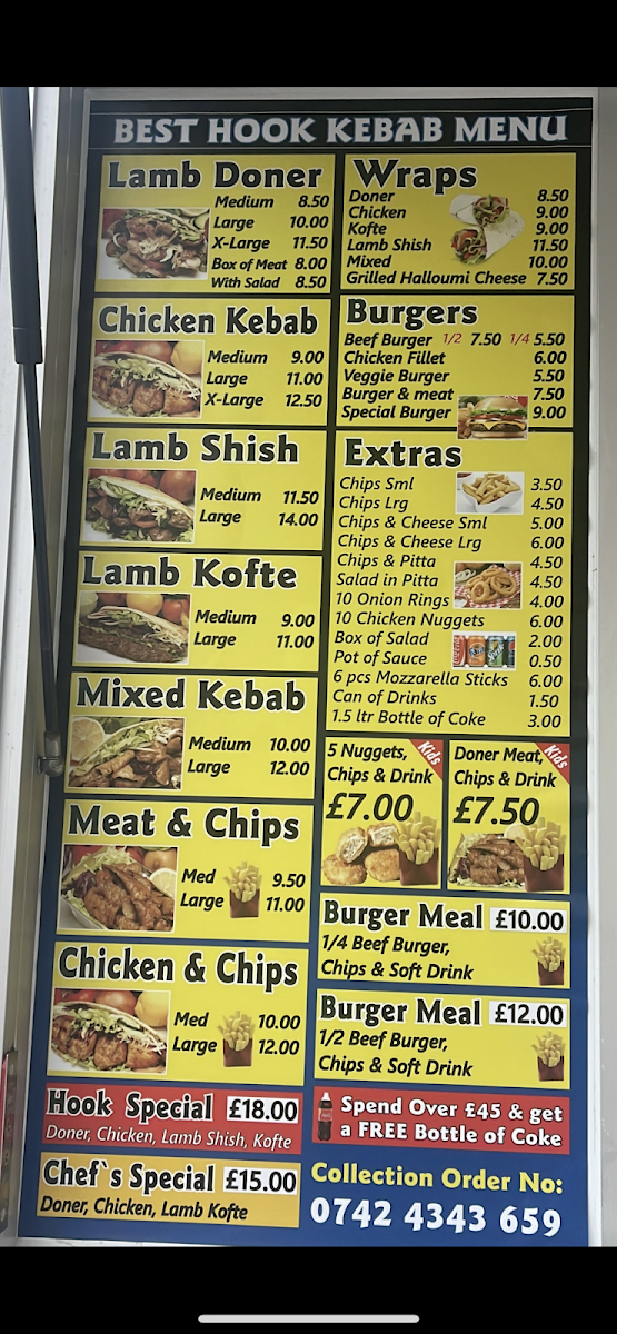 The menu at Best Hook Kebab offers a variety of flavorful options to satisfy different tastes. The wrap section includes classics like the Doner, Chicken, Kofte, Lamb Shish, and a Mixed option, providing a great choice for those craving a hearty, portable meal. For burger lovers, there's the Beef Burger, Chicken Fillet, Veggie Burger, and the more indulgent Burger & Meat and Special Burger. The extras section ensures that every meal can be enhanced with sides like Chips Sml, Chips Lrg, Chips & Cheese Sml, Chips & Cheese Lrg, and Chips & Pitta. Additionally, the menu features a unique option with the 1/4 Beef Burger, perfect for those wanting a lighter but still satisfying bite. Each dish on the menu provides a perfect balance of taste and variety, catering to all preferences.